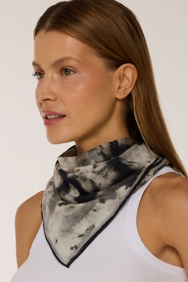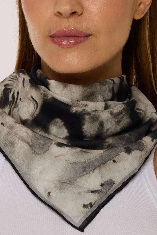 The collection is urban, label-free, and stylish. It features seven cotton scarves, measuring 65x65cm. The prints explore contrasts: the graphics of hydraulic tiles meet the power of the black leopard, stitched together in a gradient that transitions between sober and wild. All in shades of black, gray, and brown.