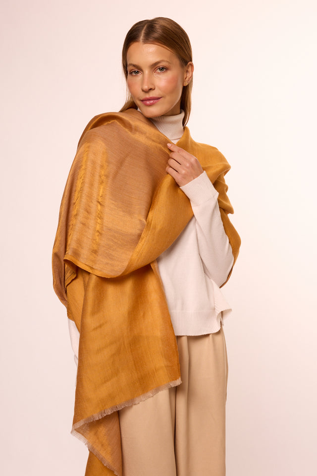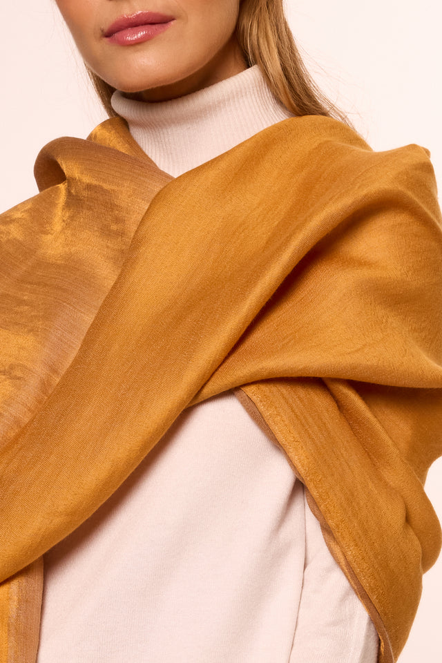 Highlighting luxury and elegance, the Pashmina made of pure Cashmere with silk, Double Face Zari, is perfect for warming up your coldest days.