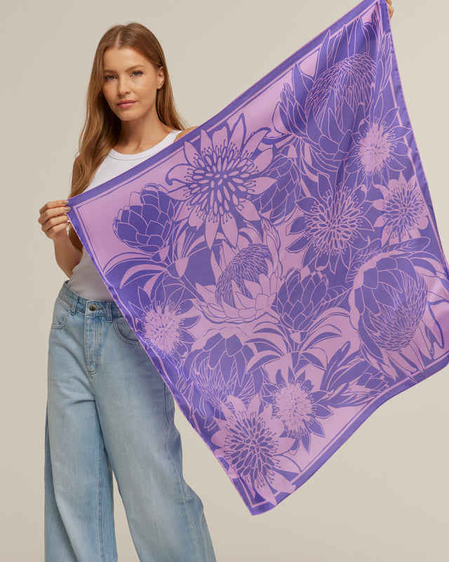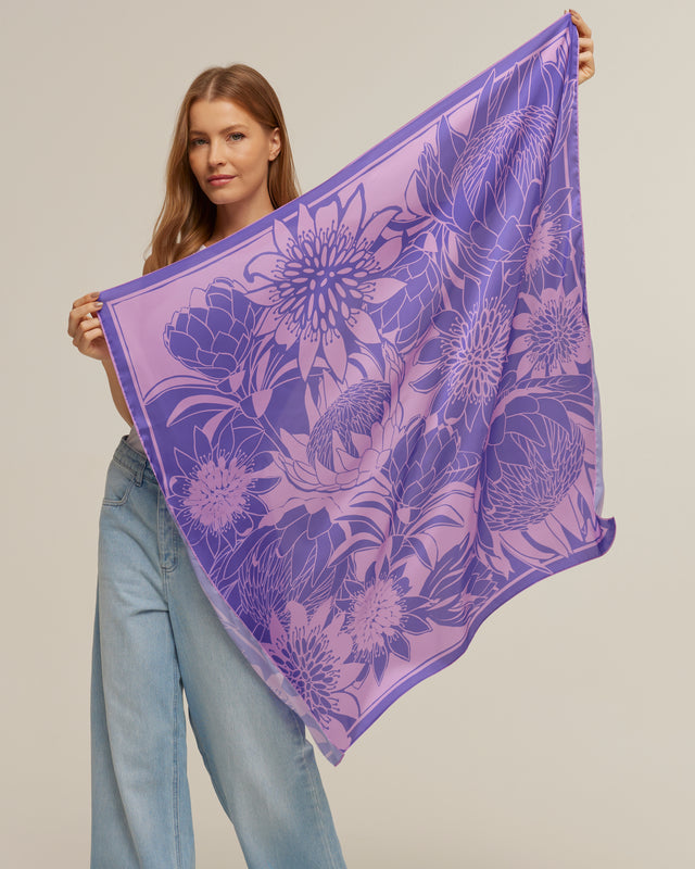 Purple Flower of Power scarf in polyester satin | 90x90cm