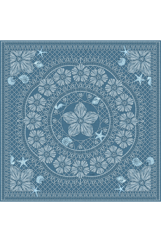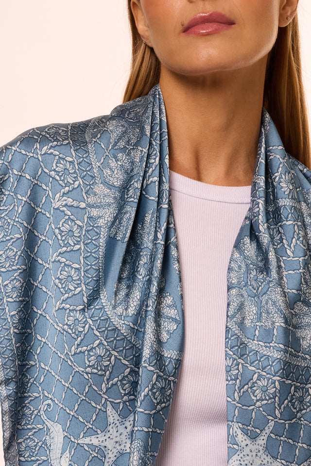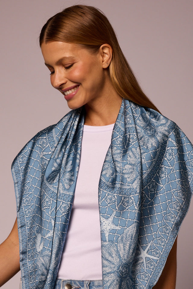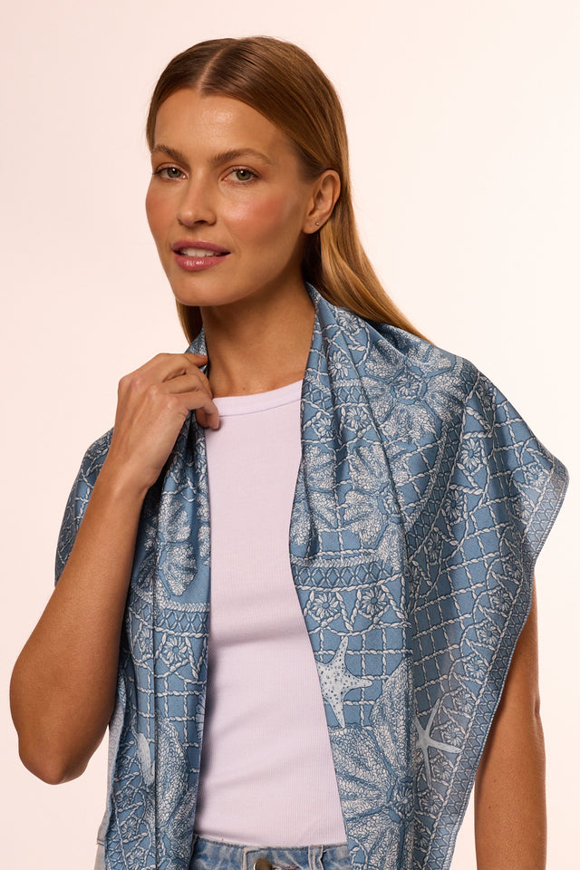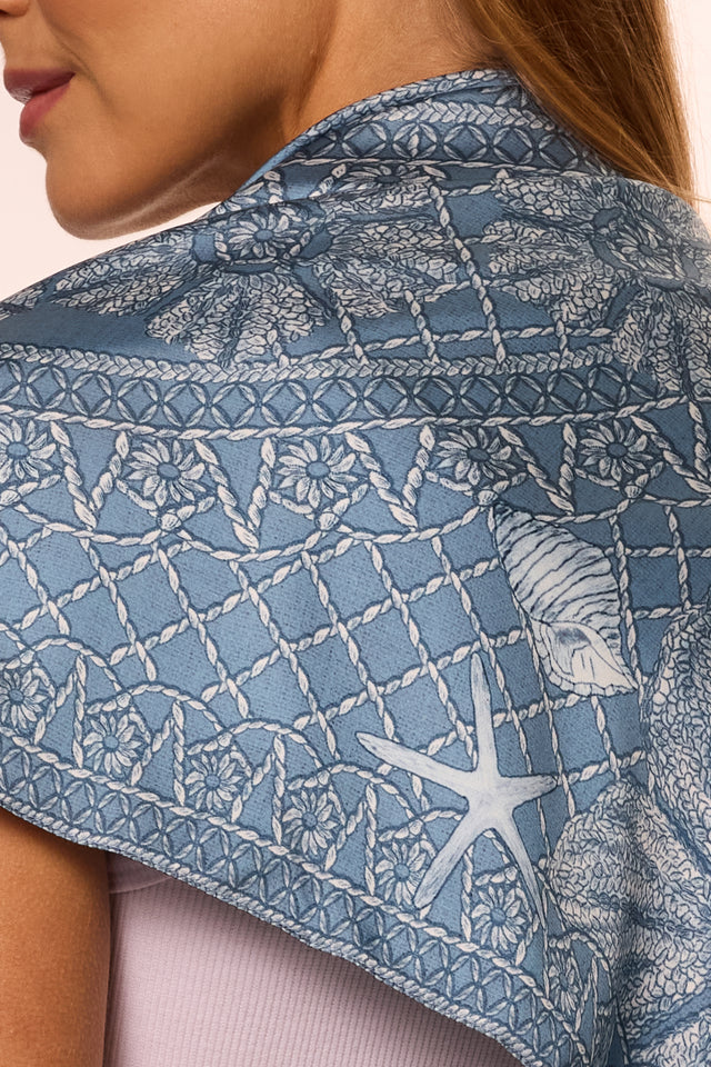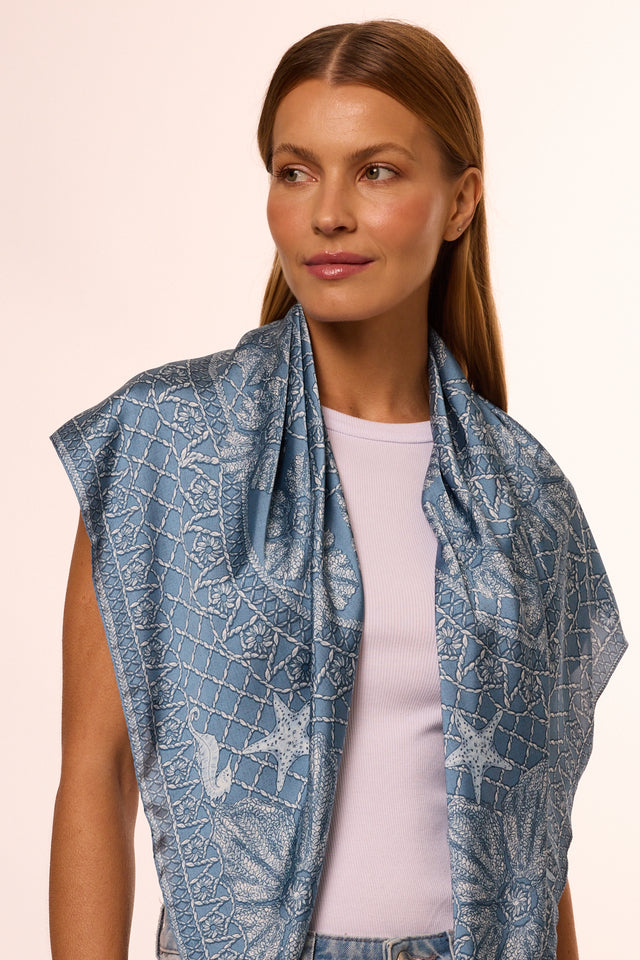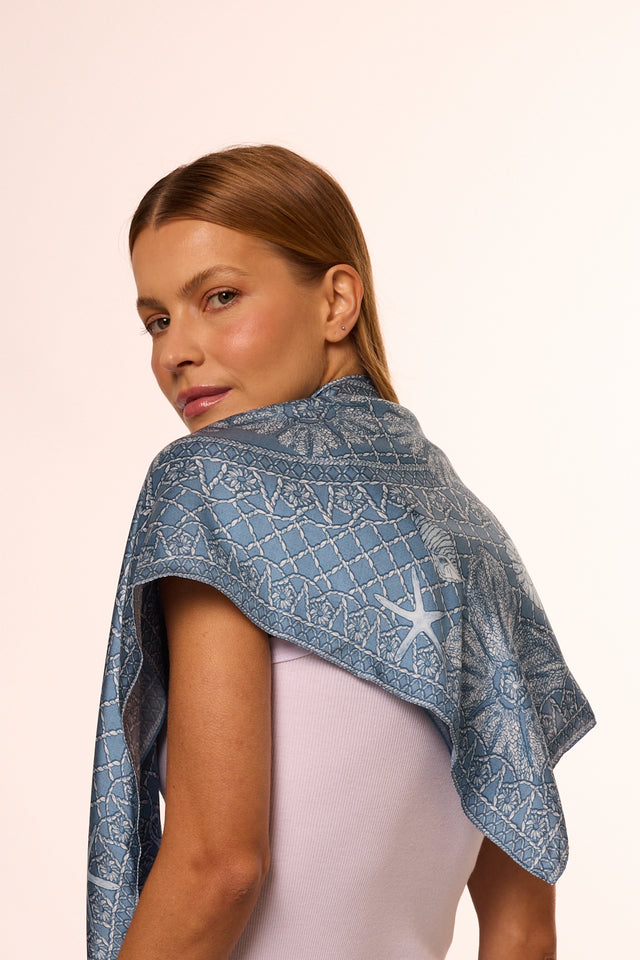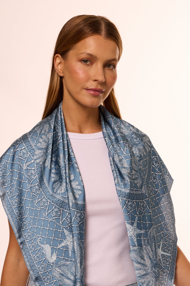 Lenço Ritos de Mar azul em cetim de seda | 90x90cm