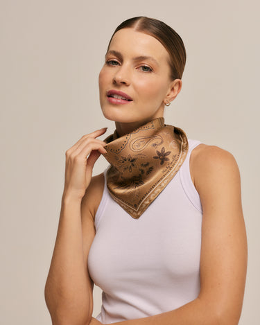 The 40x40cm scarf is the perfect accessory for those looking for a sophisticated and versatile detail in their look. Its compact size allows for multiple ways of wearing it, such as a bracelet, hair tie, detail on bags or even around the neck for a delicate touch . It is the ideal complement for a modern and elegant look, without weighing down the production.