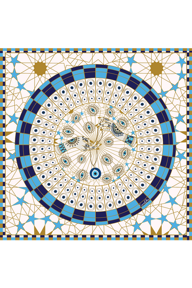 The collection reflects this mystical and spiritual universe. In different cultures and religions, such as Judaism, Buddhism, and Islam, the evil eye is revered as a guardian against evil. The starry shapes and graphics on the scarves evoke the beauty and strength of this protection that accompanies every step of the way as a new year begins.