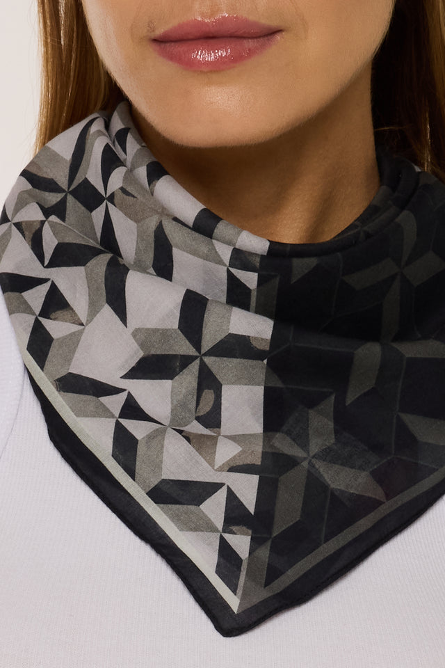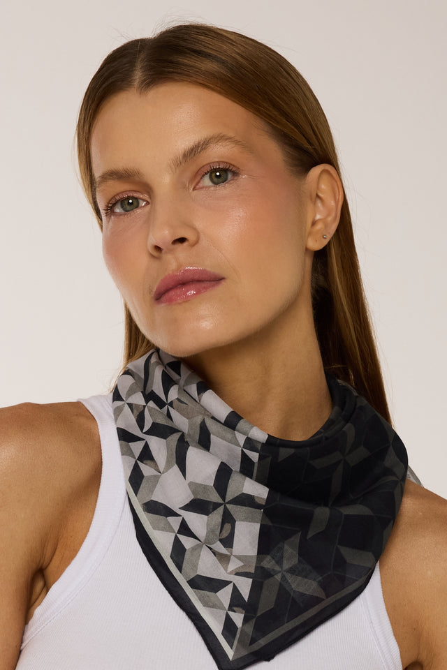 The collection is urban, label-free, and stylish. It features seven cotton scarves, measuring 65x65cm. The prints explore contrasts: the graphics of hydraulic tiles meet the power of the black leopard, stitched together in a gradient that transitions between sober and wild. All in shades of black, gray, and brown.