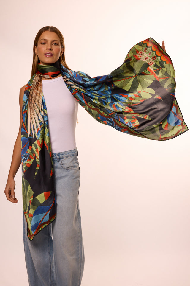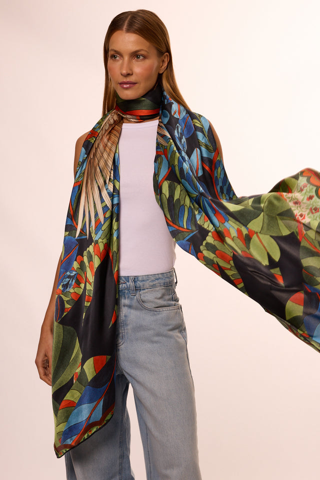 Our Pantanal scarf is a statement piece made from 100% pure silk satin , with a lightweight drape and sophisticated sheen. Its maxi shape (130x200cm) allows for endless uses—as a giant scarf, an elegant shawl, or even a luxurious layering over an outfit.