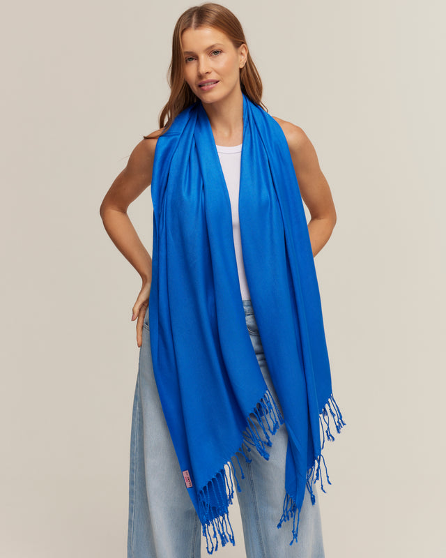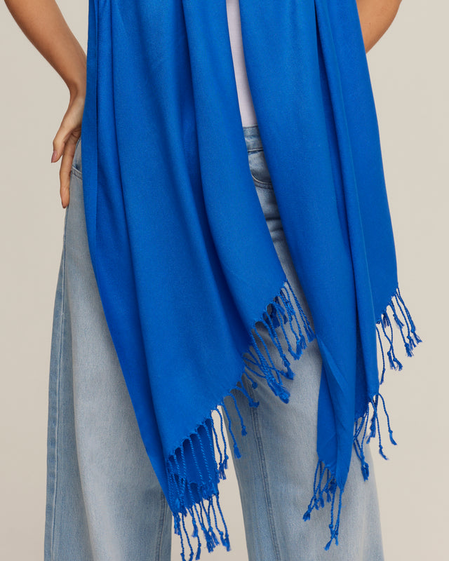 A Pashmina azul de viscose é a melhor companhia para os dias frios deslizando sobre seus ombros e nunca perder o charme e elegância em todas as ocasiões de uso.