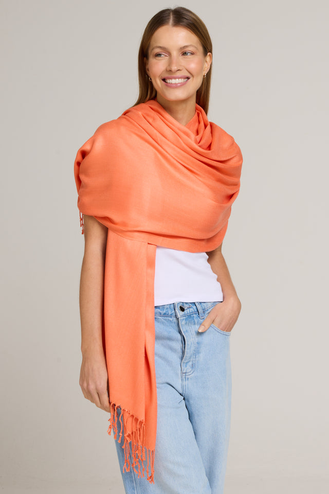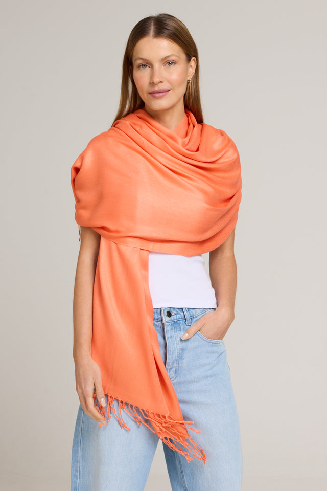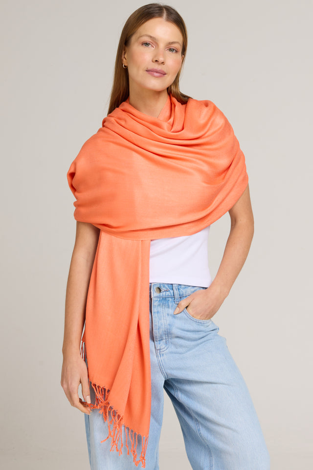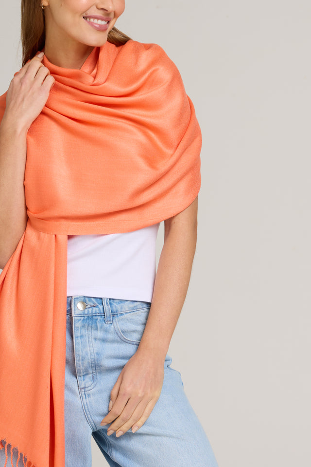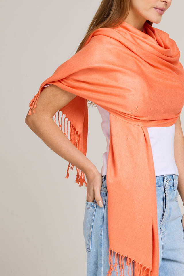 A Pashmina coral de viscose é a melhor companhia para os dias frios deslizando sobre seus ombros e nunca perder o charme e elegância em todas as ocasiões de uso.
