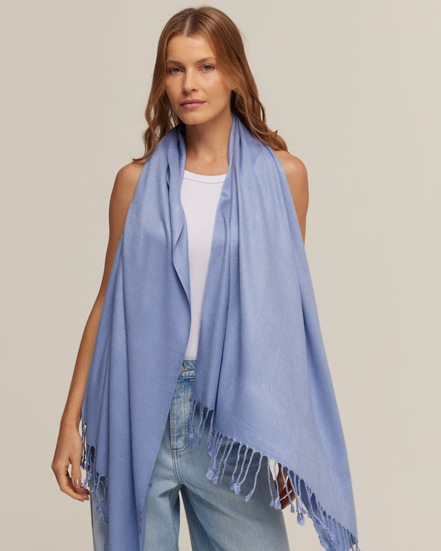A Pashmina azul jeans de viscose é a melhor companhia para os dias frios deslizando sobre seus ombros e nunca perder o charme e elegância em todas as ocasiões de uso.