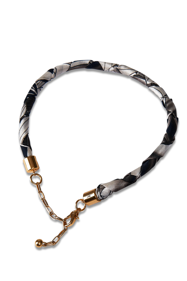 O colar é feito em latão (o aro interno), tecido e metais de acabamento em zamak e banho dourado com finalização em verniz alemão.
