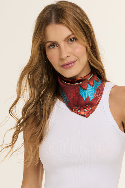 O lenço possui o toque acetinado com brilho e caimento super leve.