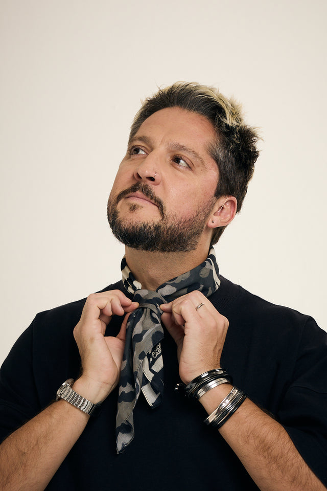 Chegou a primeira collab da Scarf Me com um homem: André Vasco, comunicador nato, criativo 24/7 e apaixonado por lenços. A coleção nasceu dessa relação real e espontânea com o acessório, usada no dia a dia com estilo, personalidade e liberdade.
