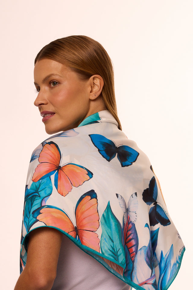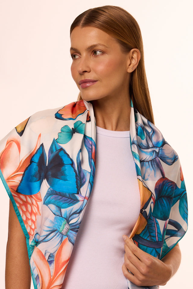 Lenço Yasmin floral branco em cetim de poliéster | 90x90cm